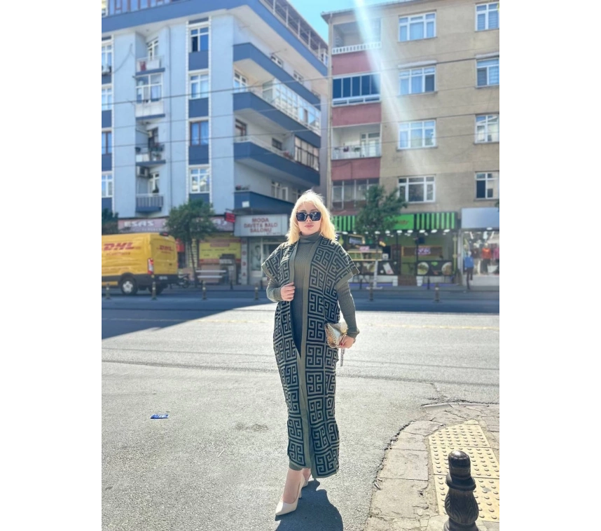 Şıklığı ve rahatlığı bir arada sunan siyah çizgi desenli elbiseli hırka triko takımı ile tarzınızı konuşturun. Bu haki renkli takım, şık görünümüyle dikkat çekiyor.