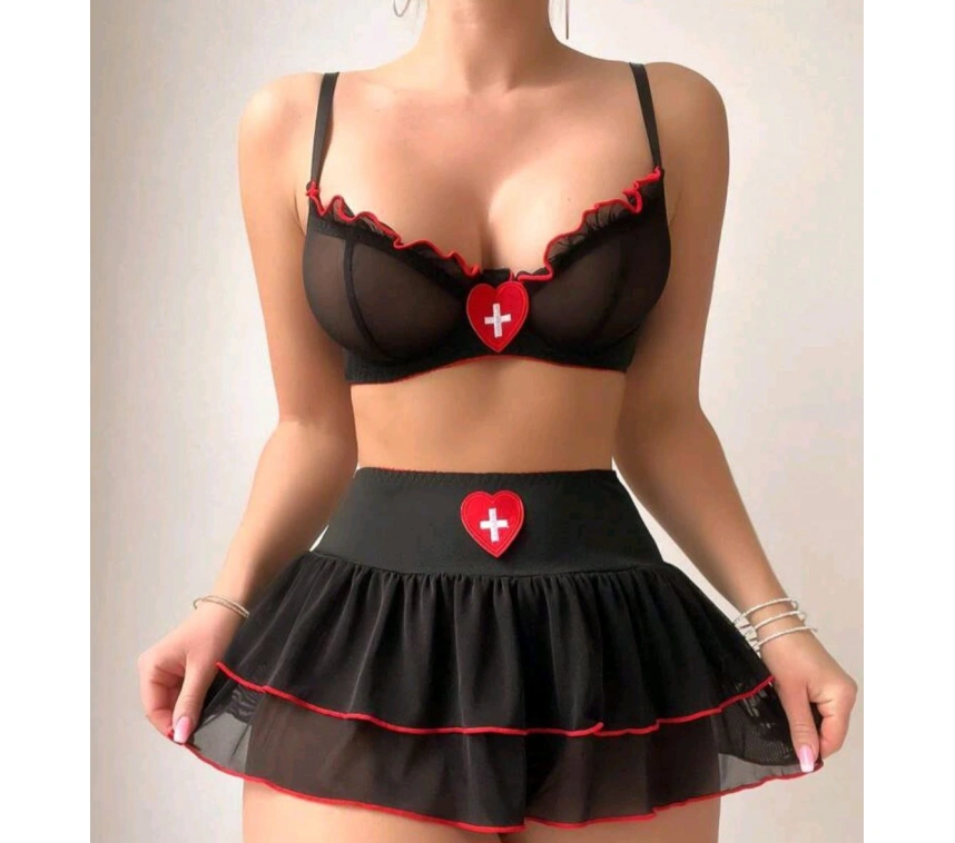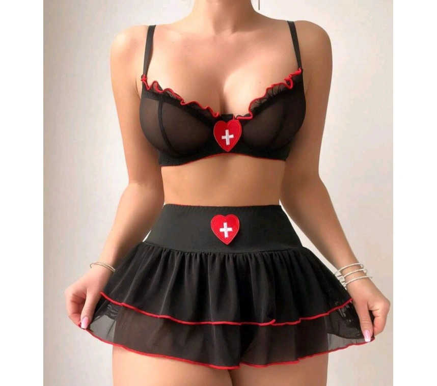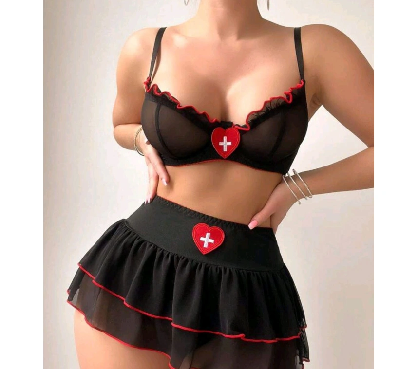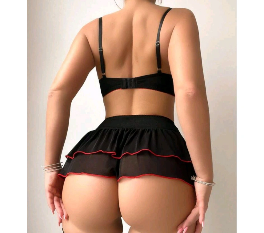 Tarzınızı yansıtın ve kendinizi özel hissedin! Bu siyah ve kırmızı detaylı iç çamaşır seti, zarafeti ve cesareti bir arada sunuyor. Kaliteli tül kumaşı sayesinde yumuşak ve rahat bir his sunarken, kırmızı kalp aksesuarı ve fırfır detayları şıklığı tamamlıyor.
