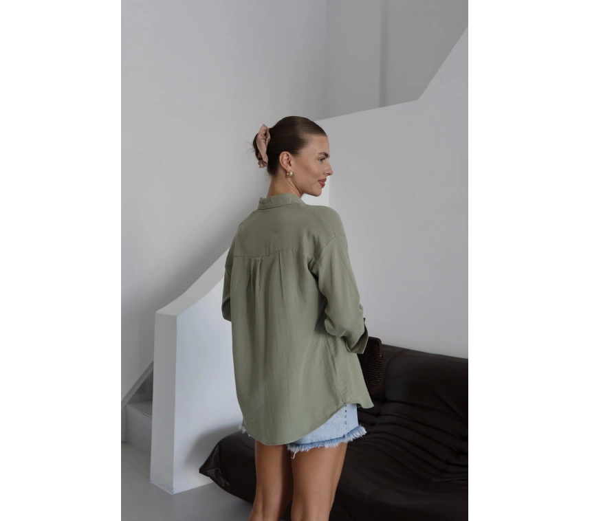 Bu haki rengiyle şıklığı ve rahatlığı bir arada sunan tek cepli müslin gömlek, gardırobunuzun vazgeçilmezi olmaya aday! Yuvarlak yakalı ve düğmeli olan bu gömleğin özellikleri şöyle: