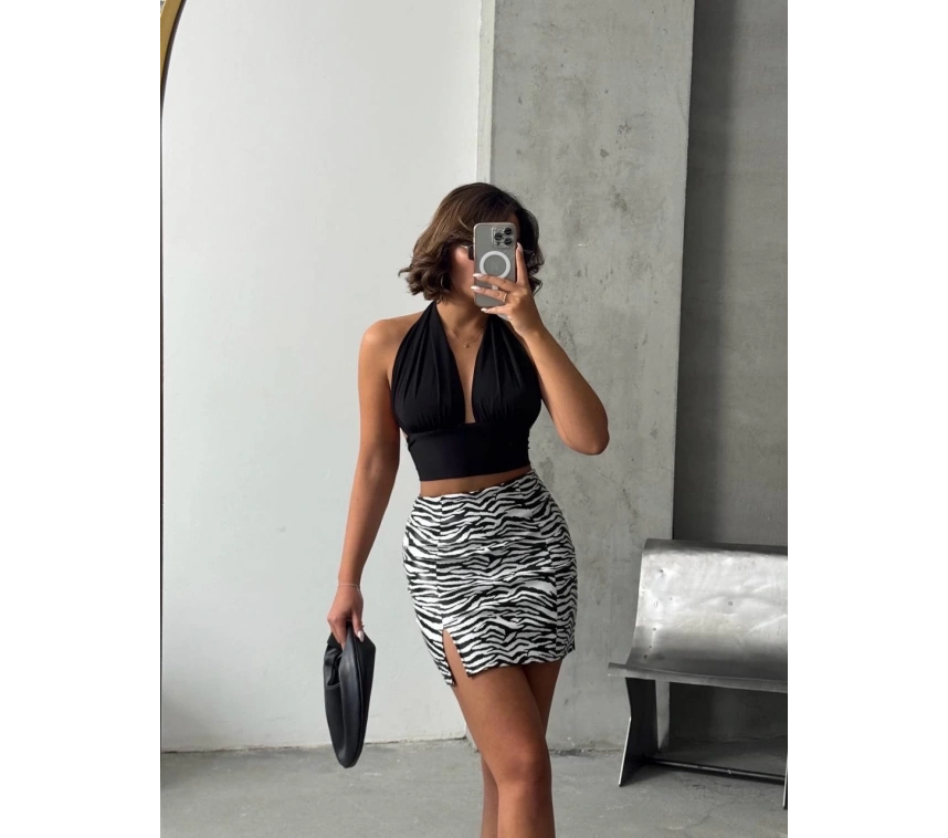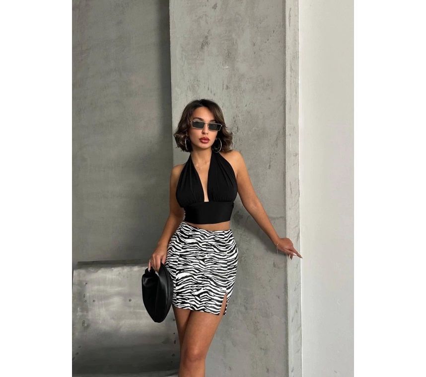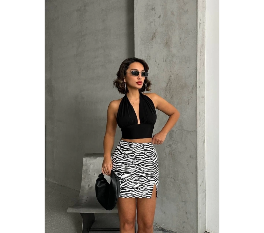 Beyaz deri etek, şıklığı ve modern tasarımı bir arada sunuyor. Zebra desenli detayları ile trend bir görünüm elde etmenizi sağlar.