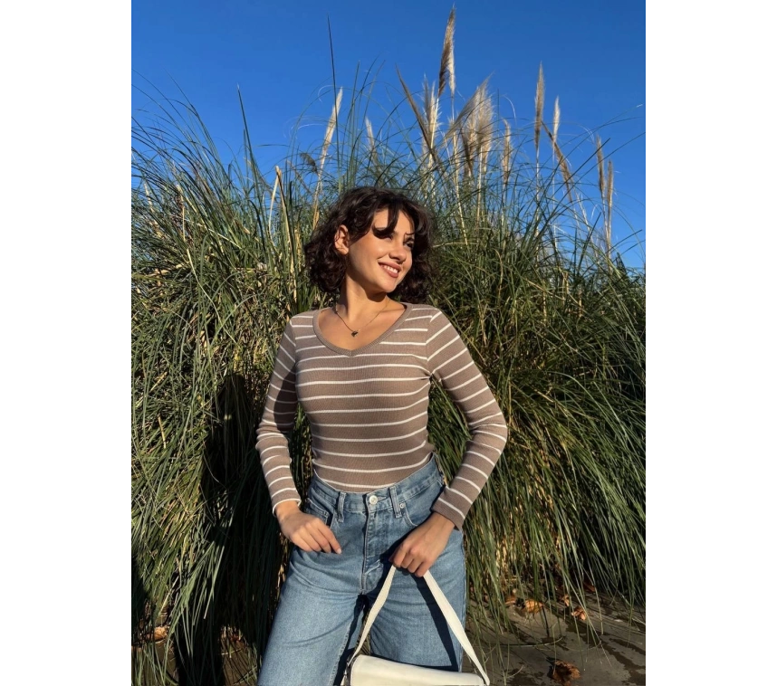 - Elastik yapıya sahip olan bluz, bedene tam oturur.