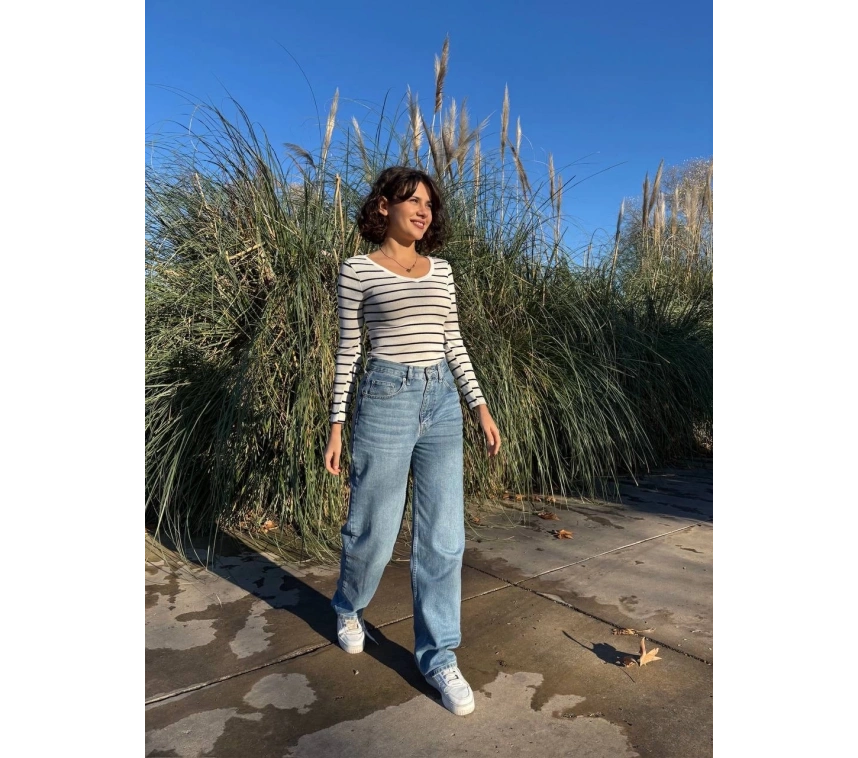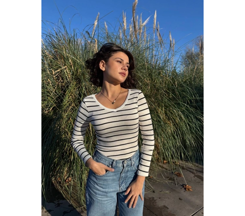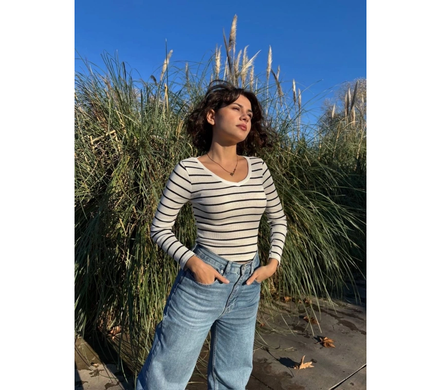 Şıklığı ve rahatlığı bir arada sunan beyaz V yaka çizgili bluz A3699, gardırobunuzun vazgeçilmezi olmaya aday!