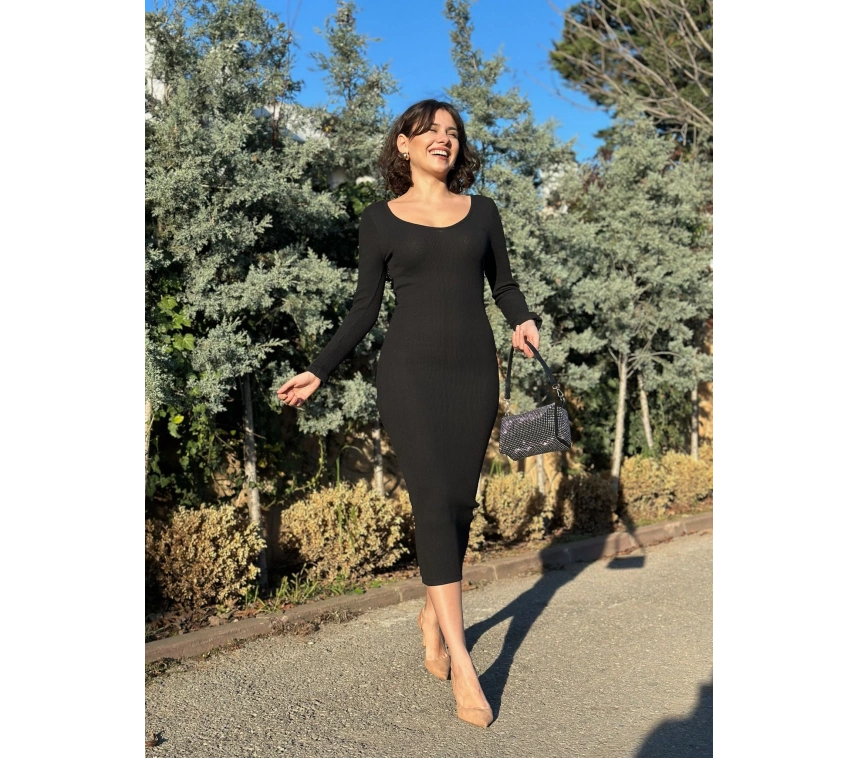 Bu siyah Midi Boy Elbise, şıklığı ve rahatlığı bir arada sunuyor. V yaka detayı ile feminen bir görünüm sağlarken, uzun kollu tasarımı sayesinde soğuk havalarda da tercih edebilirsiniz. Midi boyu ile günlük kullanıma uygun olan bu elbiseyi isterseniz topuklu ayakkabılarla şık bir kombin oluşturabilirsiniz. %100 pamuklu kumaşıyla gün boyu konfor sunarken, şık detaylarıyla da göz kamaştırıcı bir görünüm elde etmenizi sağlar.