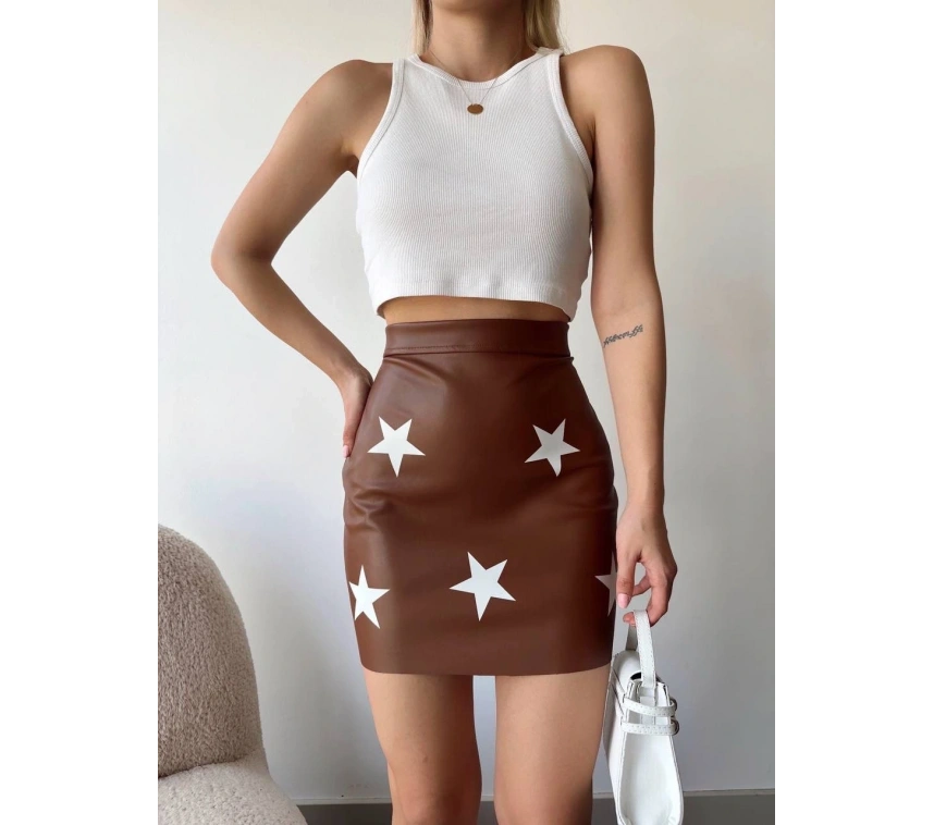 Bu şık ve trend yıldız baskılı deri etek, gardırobunuza yıldızı bir parça ekleyecek! Modern ve şık tasarımıyla her kombini mükemmel bir şekilde tamamlayacak.