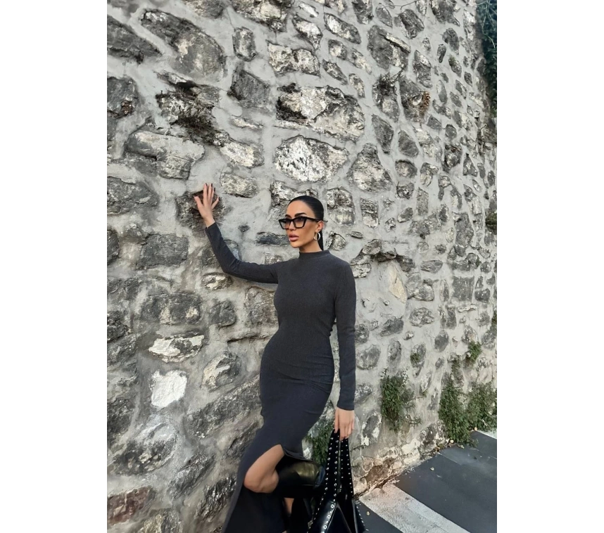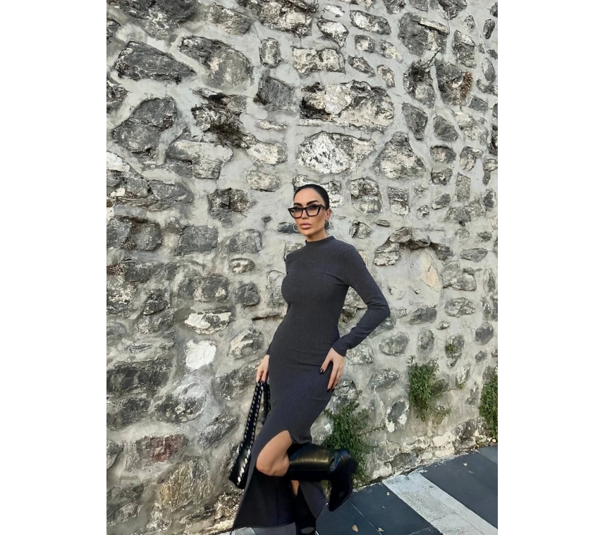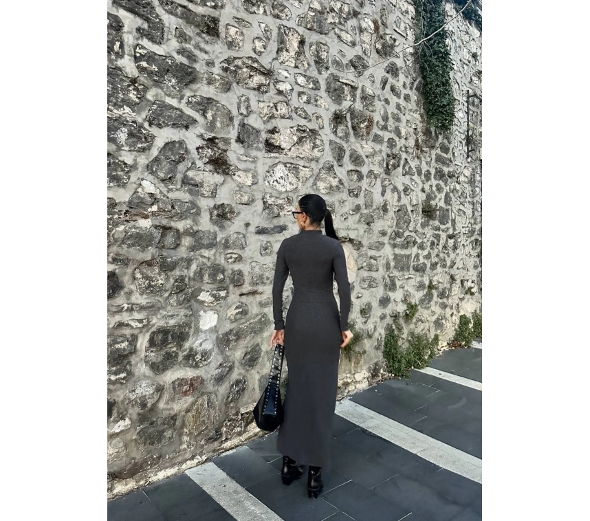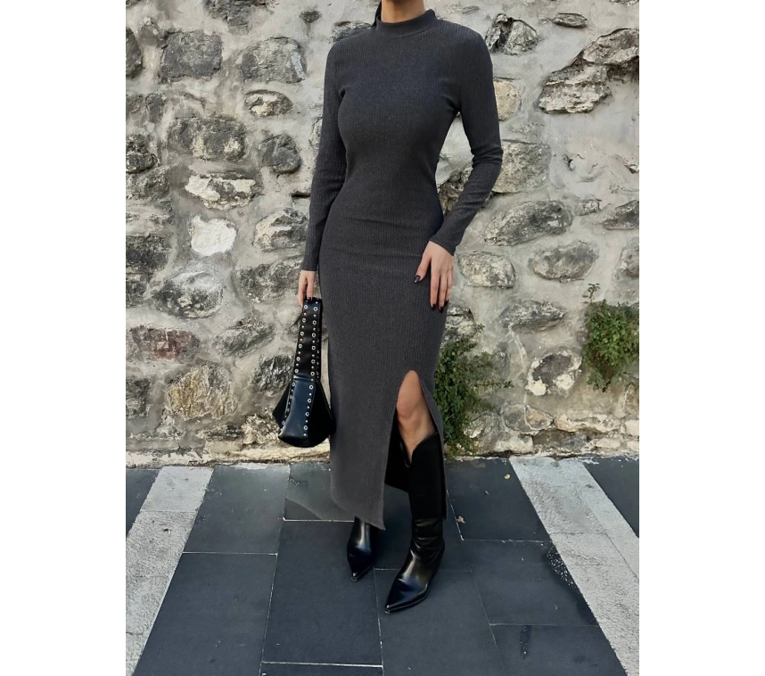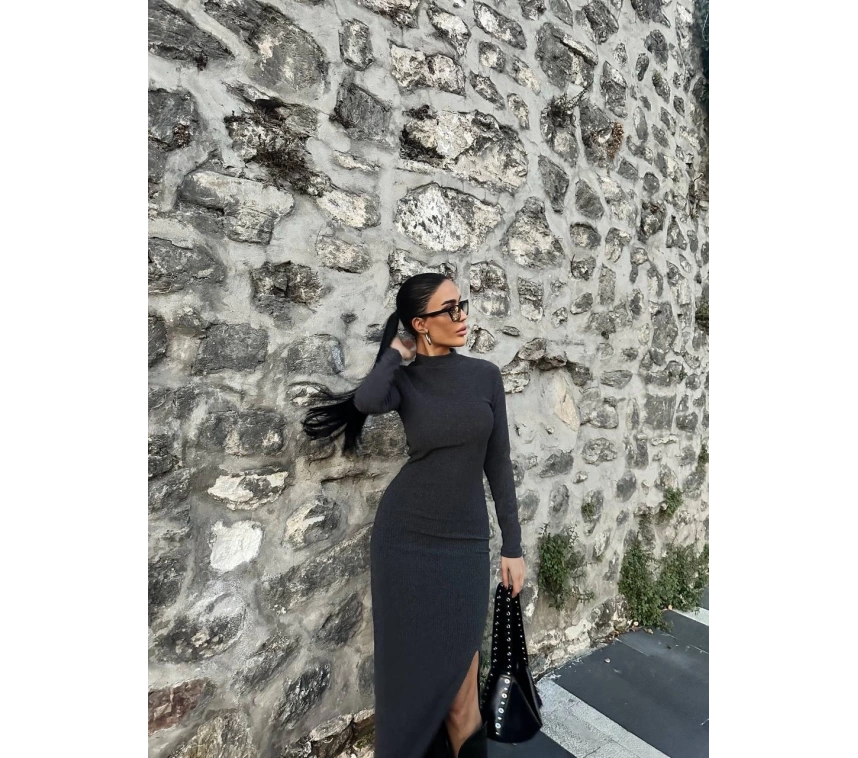 Yırtmaçlı kalın bürümcük uzun elbise siyah, şıklığı ve rahatlığı bir arada sunar.